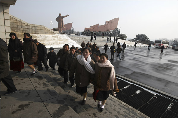 Today, North Korea, with its highly centralized system and tight controls on the daily lives of its people, remains firmly in the grip of its leader, Kim Jong-il. He and his father, Kim Il-sung, are the subjects of a personality cult that requires portraits in every home and their images on lapel pins on the jackets of every official. Huge statues of the older Kim dominate cities (shown above, click to enlarge). The state operates what human rights experts say is a vast gulag of labor camps, many filled with the ideologically suspect and their families.