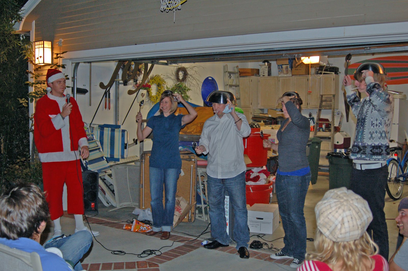 What else would make perfectly normal college people and grown-ups wear metal bowls on their heads, associate with a poorly dressed Santa impersonator from the hood, stuff their mouths with Tootsie Pops, and try to guess Christmas tunes?
