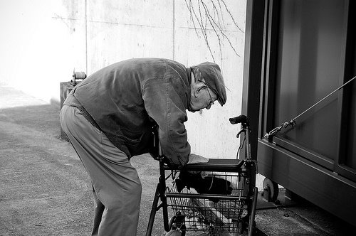To my left, out of the car window, was an elderly man, towing behind him a small shopping cart. He was not on the sidewalk, but moving diagonally through the gas station on the corner. He was not moving easily, not at all. Not really walking, more like shuffling, very very slowly. It was as if he was existing in a time warp that was 1/5th that of everything around him. Going 15, in a world of 75 miles per hour.